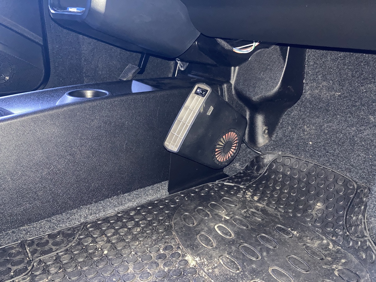 Ich habe den Heizlüfter an einem abgewinkelten Blech befestigt, welches unter die Fußmatte geklemmt wird. Der Heizlüfter wird über ein Langloch so eingestellt, dass der Luftstrahl nicht unmittelbar auf Bauteiloberflächen trifft und nach oben ungehindert in den Fahrzeugraum strömt. So wird der gesamte Innenraum incl. Sitze, Scheiben, Lenkrad usw. schön durchgewärmt und beim Ausatmen beschlagen auch die Scheiben von innen nicht.