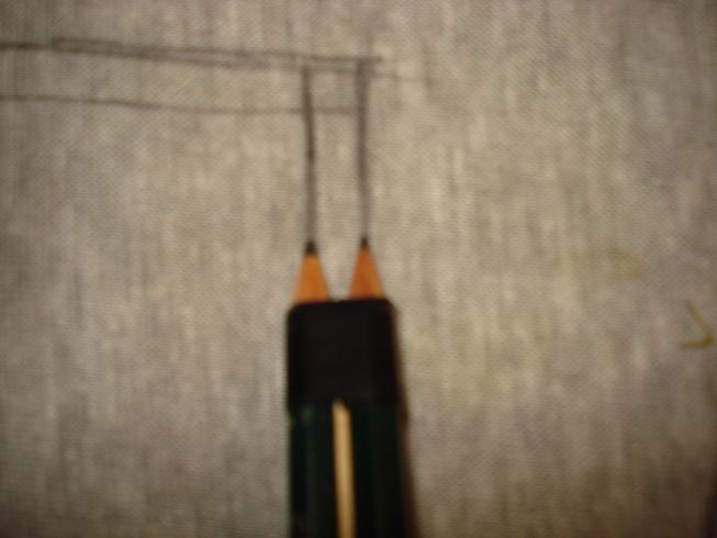 Wie auf dem Bild zu sehen, werden die 2 Bleistifte mit einem wie auch immer gearteten Abstandhalter versehen und so miteinander fixiert, das die Bleistiftspitzen 1. auf einer Ebene und 2. soweit auseinanderstehen, wie Beim Originalbezug die Naht vom Rand entfernt ist.