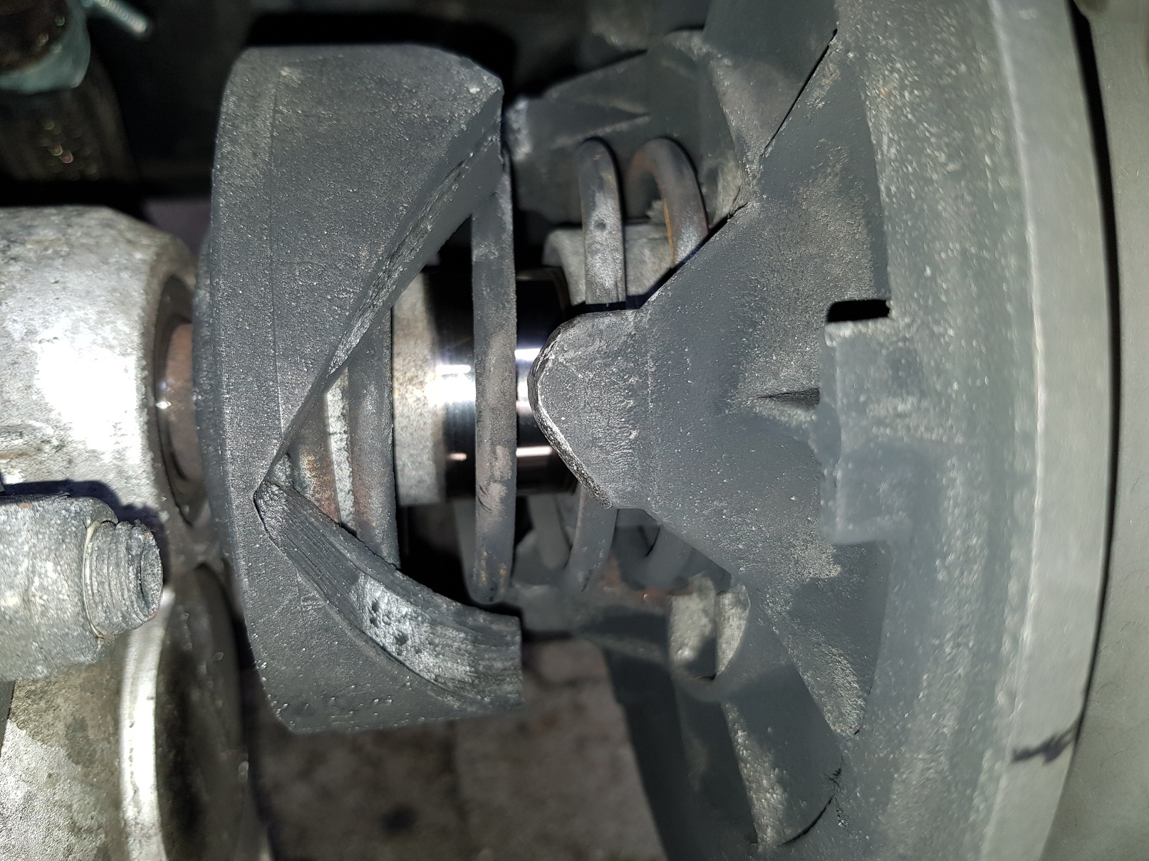 Deshalb sollte die G.Vario zerlegt werden um den beweglichen Teil gangbar zu machen. Die Feder drückt den bewegten Teil immer zusammen so daß die Gleiter praktisch immer geklemmt werden. Der bewegte Teil gleitet über die Welle. Ist diese Bewegung gehemmt ( somit bleibt die Vario offen wie es auf Deinem Bild zu sehen ist ) fliegen die Gleiter weg - weil sie nicht mehr geklemmt werden - und am aller wichtigsten: Die Vario arbeitet nicht richtig ! Das führt zu unterschiedlichen Spannungen im Riemen, die Kraftübertragung ist nicht gegeben bzw setzt schlagartig / zupfend ein.