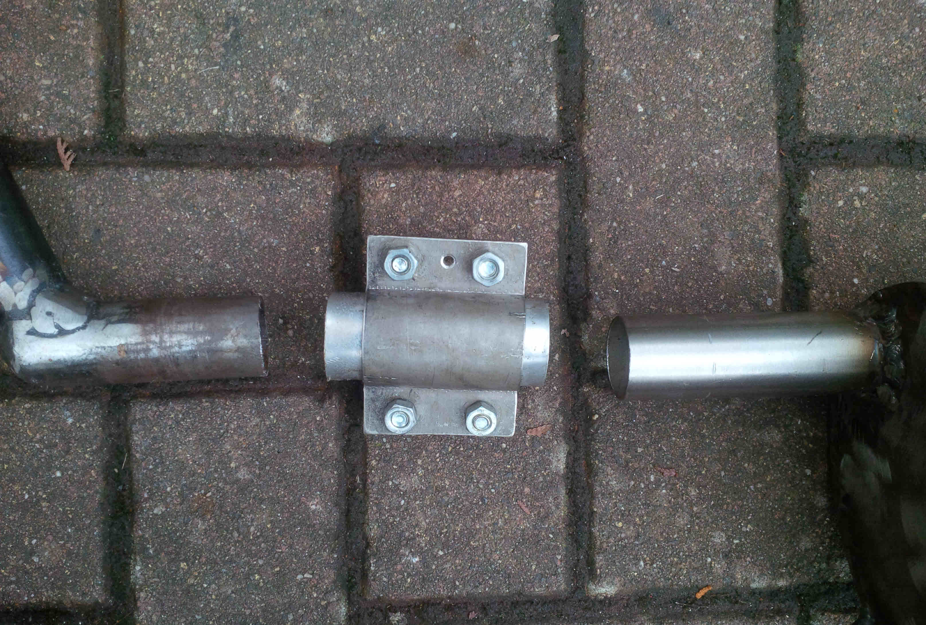 Habe noch Stahlrohr (1-Zollrohr, 33,4mm Außendurchmesser, ca 28,3mm Innendurchmesser) gefunden, also Wandstärke etwa 2,5mm, und damit das gebogene Rohr nachempfunden. Ich habe aber noch eine weitere GummiBefestigung vorgesehen und zwar etwa 5 cm vor dem Handbremshebelloch im Tunnel. Also zwischen Mitteldämpfer und Handbremsloch. Wie sich jeder denken kann, bin ich dazu etwa 100 Mal unters Auto gekrochen, damit ich das Rohr passend schneiden und schweißen kann.